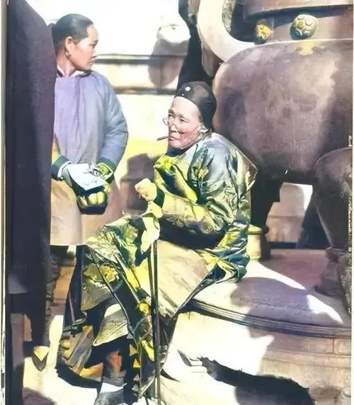 这身绣着团龙的衣裳叫蟒袍,缎面厚滑,边上滚金线,手里那根头镶铜帽的木杖一敲石阶脆生生的,身后铜鼎冒着光,丫头抱袖侍立,衣角一摆就知道家里的体面从不缺。