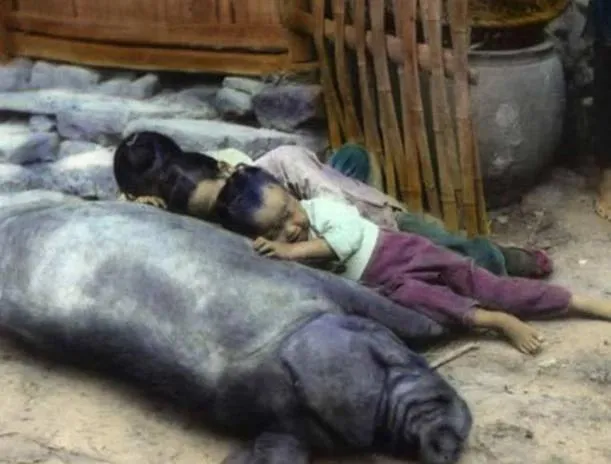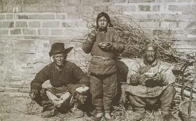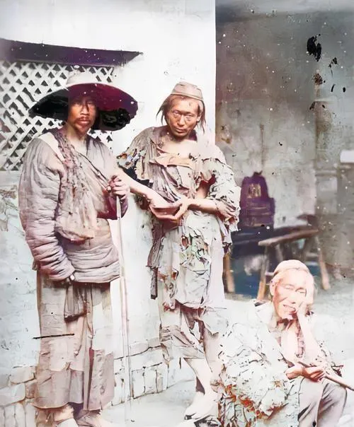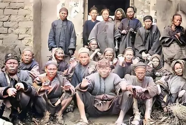 这群人身上披的是破棉絮,袖口烂成柳叶条,院门口的土台子上坐满了,手指黑,眼眶深,屋里墙上还糊着旧对联,风把纸角吹得啪啪响。