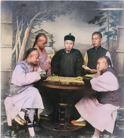 这桌子叫圆桌,桌面镶螺钿,几位裹着长袍马褂的人围着下棋,棋子黄油油的,落子有声,屋角挂着山水屏,茶盏热气腾,日子就这么慢吞吞地过。