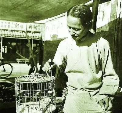 这个竹丝细密的圆笼子叫鸟笼,顶上铜环亮,笼里栖杠光滑,老人两指捏着门闩,一抬一放逗着小雀,旁边小葫芦装的是清水,早年城里胡同口一排都是这种调调,慢得很。