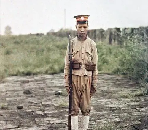 这顶红星帽戴在孩子头上,衣襟瘦得打褶,刺刀比人还精神,鞋绑着白裹脚布,站得笔直,风一过裤腿打着拍子,声音薄得很。