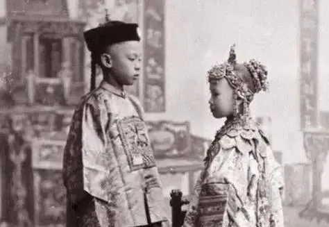 这对小人儿穿着织金缎,女孩头上的凤冠压得眉心发紧,小靴厚底,走一步会咯噔一声,男孩眼神正经得很,像背了书才来的。