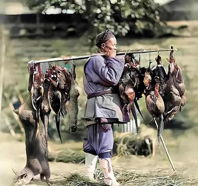这根抬在肩上的叫扁担,左右挂着野鸡野兔,皮毛亮,羽毛花,脚下草还湿着,打猎人嘴角含着烟锅,肩头压痕深,回去一秤,能换些碎银。