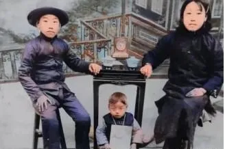 这张桌上摆个闹钟,小孩坐在小板凳上,两口子衣服乌亮,屋角的栏杆画得花,照相先生喊一二三别眨眼,眨不得,眨了就糊。