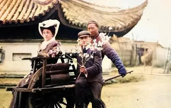 这辆两轮车把手粗,座位木条紧,车前两位捧着花枝,后头的车夫胳膊上青筋鼓着,帽檐压低,笑得客气,脚下却站得稳。