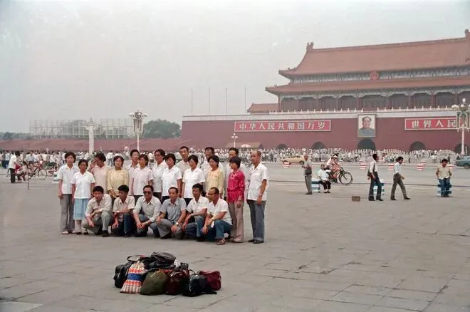 1986年,北京天安门广场前合影留念的游客,一旁还放了不少的行李。从小我们就会唱“我爱北京天安门”,来到北京天安门是不少人儿时就有的梦想。