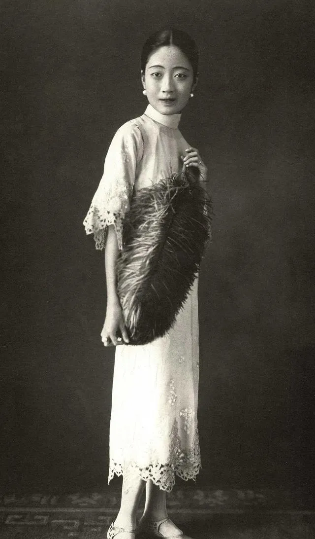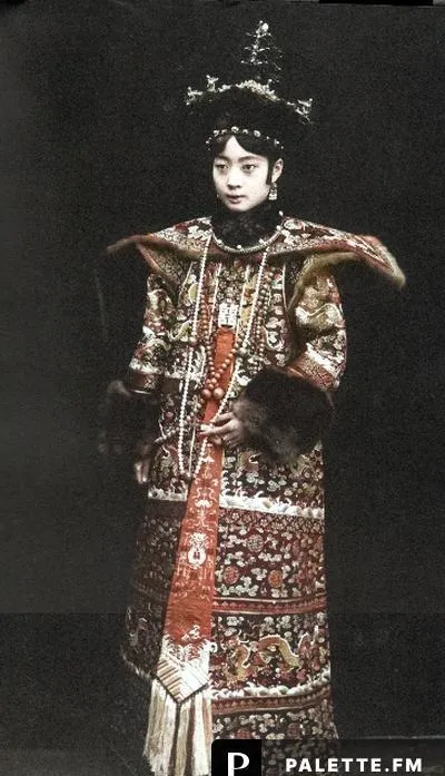 这个厚重的礼服叫大礼朝服,红地缂丝绣团龙,领口袖口都压着毛边,几串沉甸甸的朝珠从肩上垂下来,走起路来珠子磕在扣子上,叮的一声脆,小时候我不懂分量,只记得在照片前琢磨,这么宽的领翼怎么回身不磕到墙。