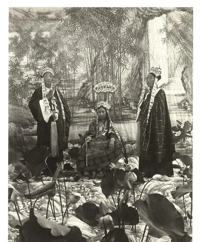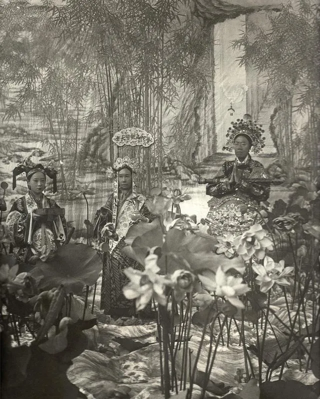 这处像园子,其实是影棚布景,竹林和石门是画,前景一池荷花是道具,以前拍照要把“戏台”先搭好,人坐进去才有气口,现在手机咔嚓一下就完事了。