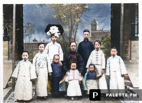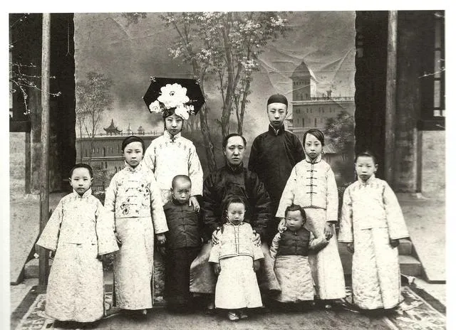 这排人多的叫家族合影,后头屏风上画山水,前一排大人稳,后一排孩子眼睛乱转,我小时候在照相馆也站过这种队,师傅喊别眨眼,偏偏有人打了个喷嚏,笑场一片。