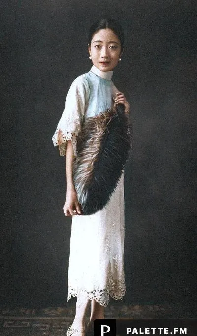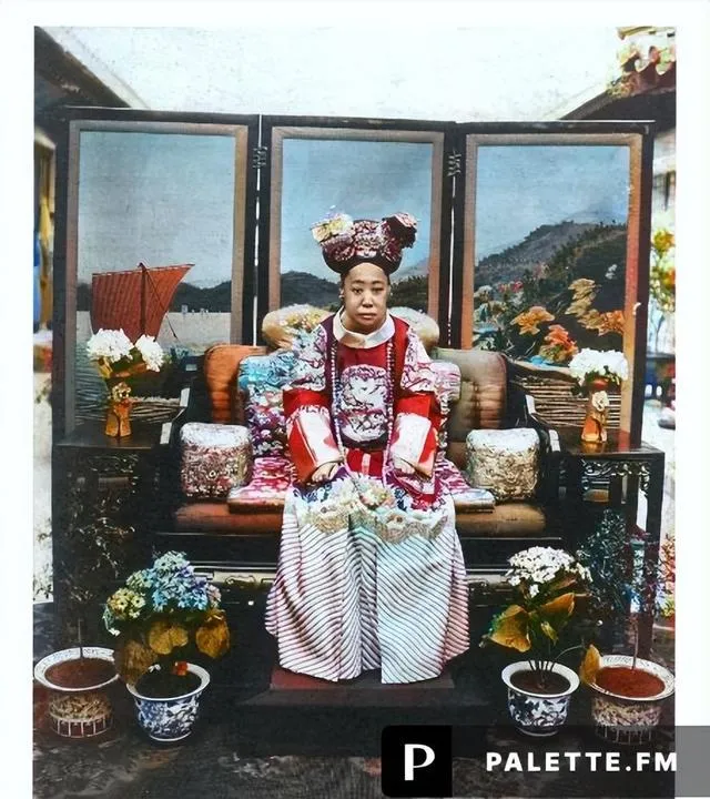 这个黑亮的发饰叫旗头,花团从一侧挑出去,衣裳是浅缎,边口镂空绣得细,坐姿直直的,眼睛却有点笑意,像刚偷偷逗了猫,收了神儿让你拍。