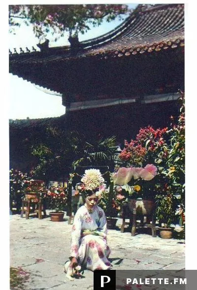 这张可有意思了,手里掐着新鲜花朵,背后是矮篱笆和石桌,像从午睡里醒来顺手摘了两朵,空气都是热的,小景不摆官架子,反倒亲。