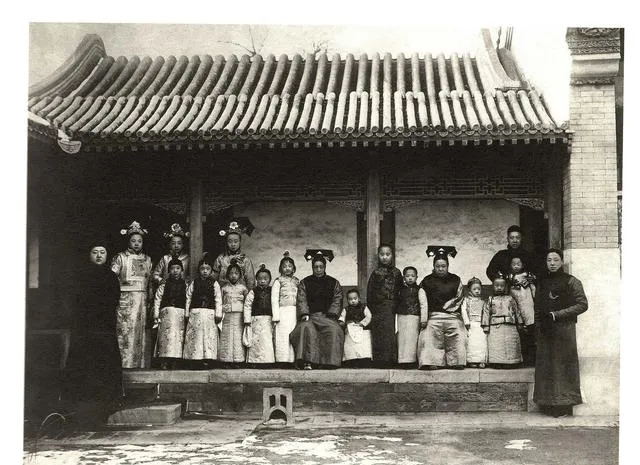 这一长檐下站满人,大小辫梢垂着,衣裳层层叠叠,我外公看见这种老院子就感慨,以前人多事杂全在一个院里转,现在散开住楼里,合影得先拉个群约时间。