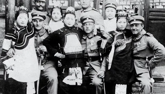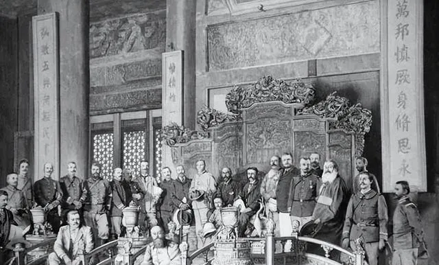 这屋里坐了一圈洋人,后面是花团锦簇的雕屏,这伙人叫联军军官,腿上靴子亮得能照脸,袖口章一圈一圈盘着,站在正中的那把椅子,本来不是给他们坐的,他们却端得稳稳当当,这一幕拍下来,像把朝廷的脸按在地上搓了几把。