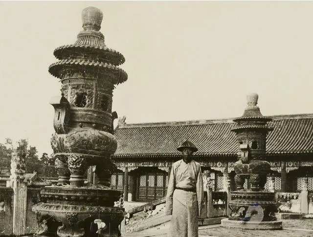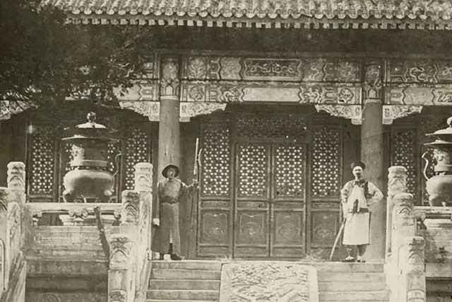 老照片:宫墙外的太监相貌丑陋,大内侍卫持青龙戟看守皇陵。