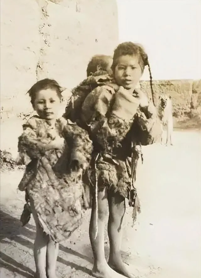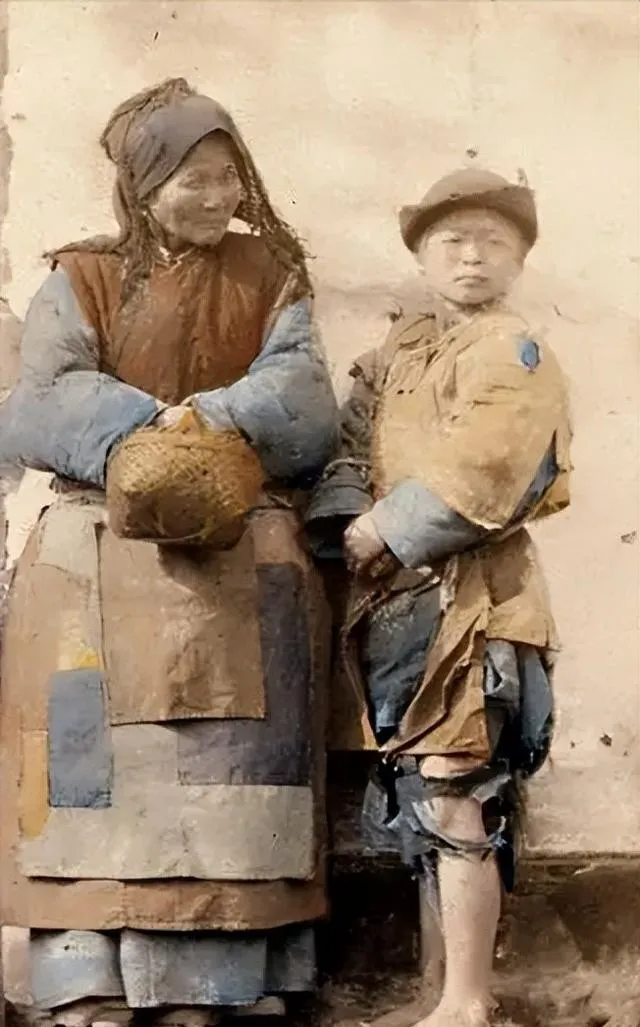 图里的这对叫讨饭人,身上贴的不是衣服,是一年一年攒的补丁,粗布细线各一截,风一吹嗖嗖往里灌,孩子手背上泥点子没擦净,眼神却极老成,街口要来要去的,是下一顿能不能吃到粥,现在咱给娃挑面料挑款式,那时候只要能挡风,就是好衣裳。