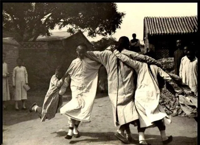 这几个一圈勾肩的叫跳房子也叫拉圈圈,长衫拖着灰,鞋底啪啪地响,旁边看热闹的笑出牙花子,我小时候在胡同里的玩法差不多,区别是我们穿的是运动鞋,他们穿的是千层底,蹦跶几下,鞋帮子像鱼鳞一样一层层起。