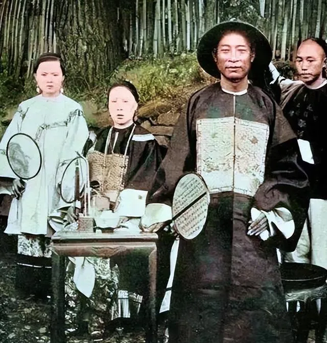 桌上摆着盏、盅、镜,旁边几把团扇叠着放,站中间的穿团龙补服,袖口里的里子是亮缎,脸上一派得意,身后竹影斑驳,场面讲究得很,现在拍全家福要修图磨皮,那时把家当摆满桌就是体面。