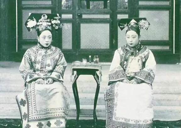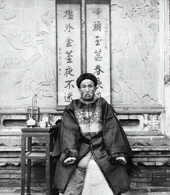 图中这位穿明黄色团龙袍马蹄袖的叫清末武官,披着裘边的氅衣,胸前一块补子晃眼,圆帽压得低低的,眼神却飘着倦意,身侧一张小几,茶壶、鼻烟壶、点香的架子挤成一角,背后石壁阴刻人物,联子写得风生水起,可人已经像风吹残烛了,爷爷说,这身行头的讲究多得很,皮里春秋谁都懂,外头再华丽,里子一松垮,也就这副样子了。