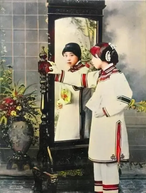 图中这面高镜叫“穿衣镜”,雕花的立柱上顶着流苏,两位小姑娘纤手扶着镜沿,眼尾扫自己衣襟的滚边,红绿镶线像糖果,镜里的人比镜外还认真,家里那口老衣柜的铜环也会在清晨叮当响一声,这点小声响,总能把人拉回童年。