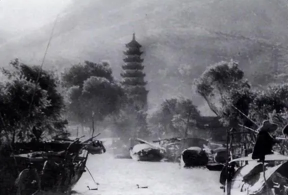 这一帧里,塔影像把水面扎稳了,渔舟靠岸,白雾起在岸柳间,动静都到位了,不用多说。