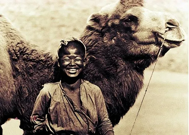 这几张跳着看更有意思,宫装的镶边厚到能当小被子,旗营武士披甲带弓,盔上的翎子立得笔直,转头却是一位黑得发亮的少年笑在骆驼旁,牙白得晃眼,穷也拦不住笑意往外冒,这生气最动人。