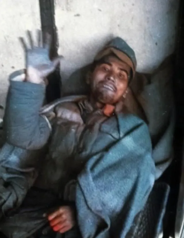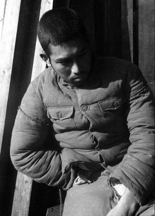 图中寒号衣一样的棉袄叫我军发的旧棉衣,打着补丁,袖肘发亮,他把手缩进怀里,脑袋歪着不看人,装着镇定,其实心里打鼓,爷爷说这种姿势多半在想怎么找机会跑。