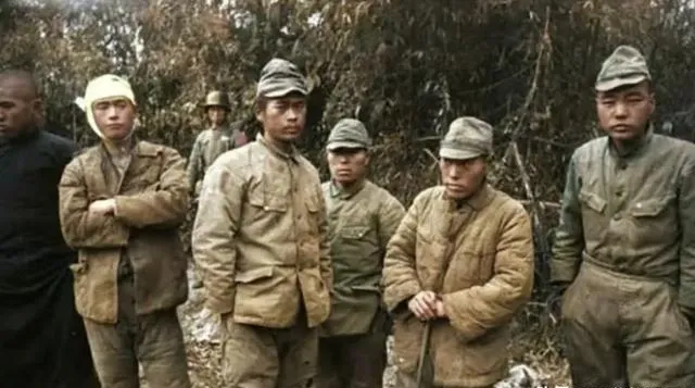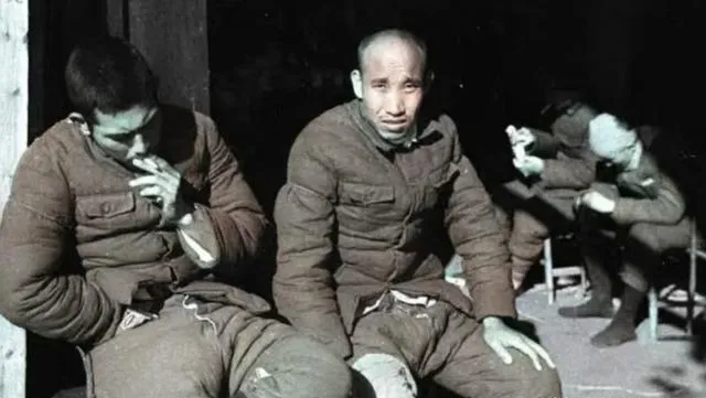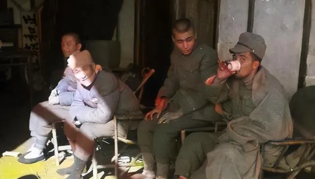 这群人站得散,军帽压得低,土黄色的棉服上灰点一层一层,最左边那位脖子上还围着条布,像是刚拆完纱布,不说话,眼神直勾勾盯人,挺扎心的。
