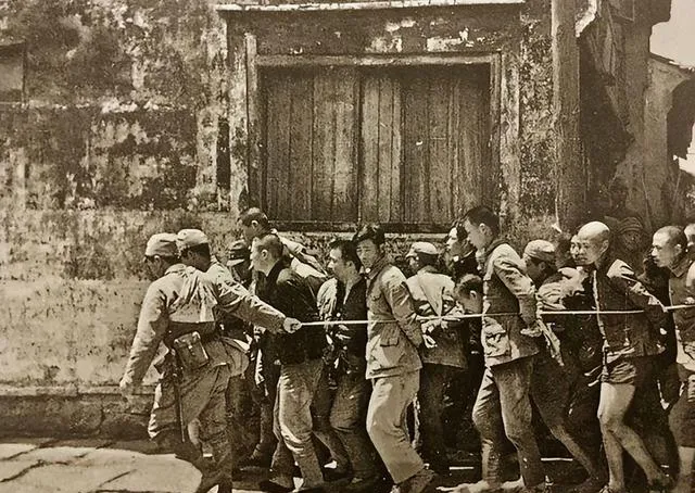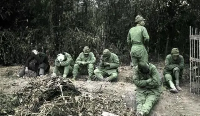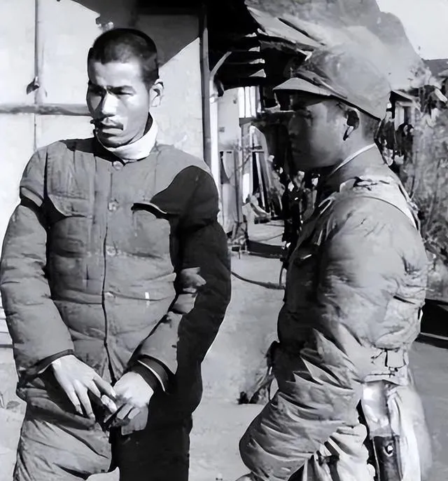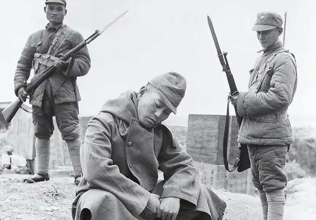 这人坐在土坡边,帽檐斜着,眼睛闭住,后面两名我军战士持枪站立,刺刀冷得冒光,沉默最压人,谁也没提高嗓门,可谁都知道规矩在这儿。