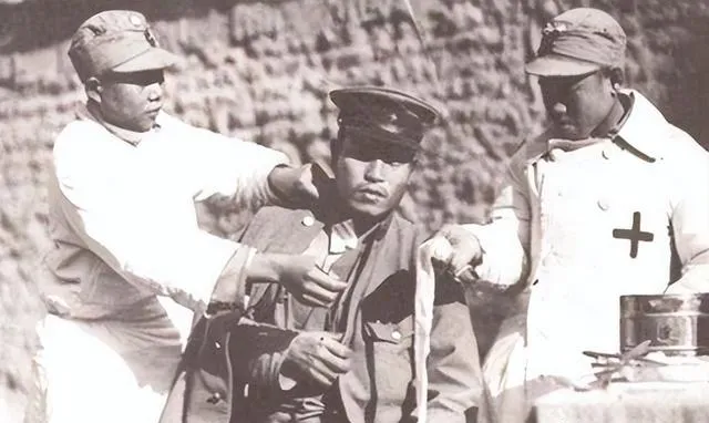 这张是卫生员的包扎台,白大褂上印着红十字,纱布从搪瓷盘里抽出来,绕过肩窝一圈又一圈,伤员把下巴抬着,脸板得硬,旁边的同志低声说别动,扎紧了就不疼了。