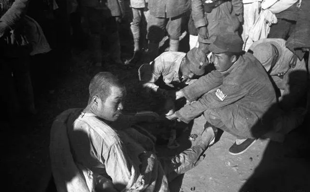 这张最扎眼的是脚面上的纱布,卫生员蹲着重新缠,里头渗出的血把棉花染了点红,伤者咬着牙不吭声,旁边有人探过头问疼不疼,他摇摇头,眼神却飘远了。