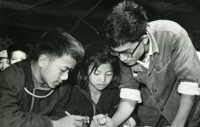 这几样家伙事儿是木板桌、粉笔、煤油灯,图里小伙俯身给姑娘讲字,铅笔头短得只剩半截,我妈说那时认字急,写完一行抬头就问对不对,念报纸要掐着点儿,新闻从城里到乡下,靠的就是这一间间夜校。