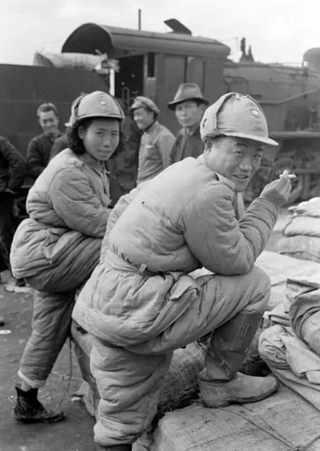 身上那层厚鼓鼓的是棉工作服,汽笛一叫,车站风像刀子一样,衣服再臃肿也得上岗,蹲在麻袋上歇口气,嘴角叼根烟的不稀奇,稀奇的是女的也在一线,抡麻袋抬钢轨,谁都没落下。