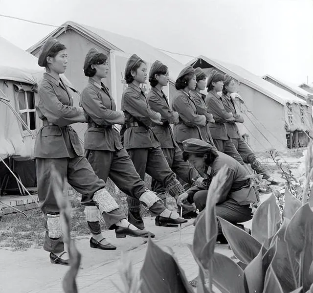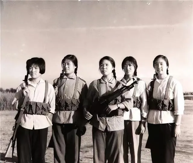 这个黑白圆圈叫人形靶,胸前成排的小袋子是背心弹袋,两位女知青站在靶旁边,笑得自信,靶心上密密的洞,说明手不抖眼不花,她们肩上挂着枪,跟今天健身房的哑铃一个意思,都是练出来的底气。