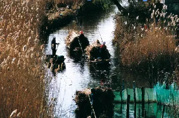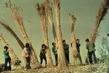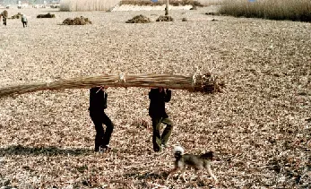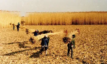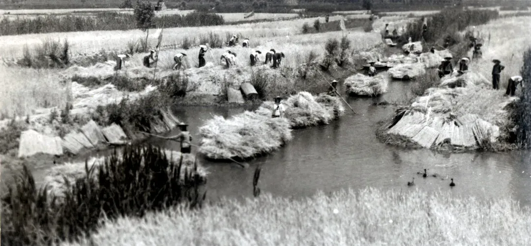 20世纪90年代以前,芦苇是桓台湖区农民的主要经济来源之一,全县种植面积最高达3万余亩,每年立冬开始统一进行收割,湖区人称“过苇秋”。整个过程分为收割、打捆、搬扛、船运等环节,是一件非常艰辛的农活。收获后的芦苇除用来制作苇箔、苇席、盖天等用品外,还加工成工艺品出口创汇。下列各图为湖区农民收割、加工芦苇的场景。