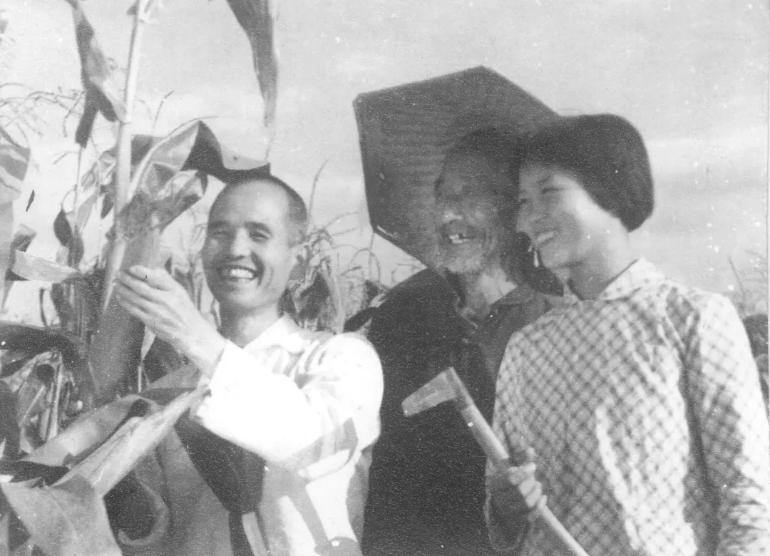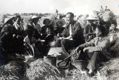 1983年,桓台县唐山人民公社党委书记张德华和社员们一起在田间学习—刘统爱摄影