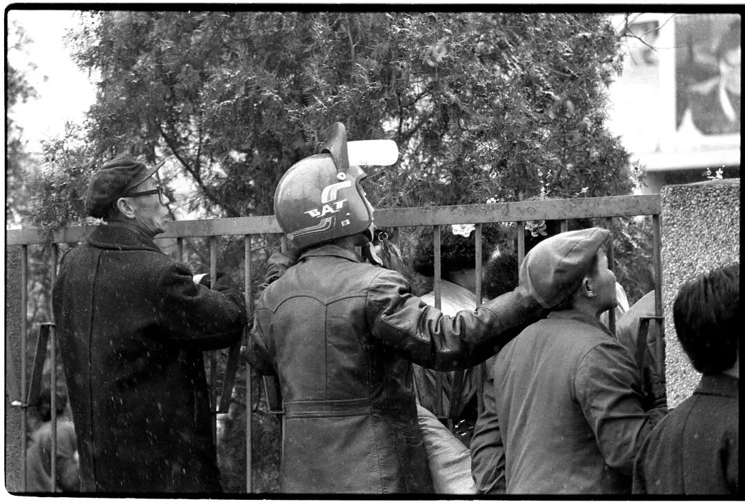 三人中,最醒目的,是中间那一位。他戴着一顶“摩托骑手”的头盔,有护目镜的那种,这在当时,是时髦与不羁的象征。一件皮上衣裹着虽然人到中年却尚未发福的身体,肩线利落,十分合身,即便只是一个背影,依然能够看出那股子干练的劲头儿。他不甘心只是“看”,而是在精神上已经置身其中,他的世界里,此刻,只有锣鼓铿锵与彩绸飞舞。一个向往速度与远方的他,正被眼前这最传统、最真实的年味牢牢吸引着。