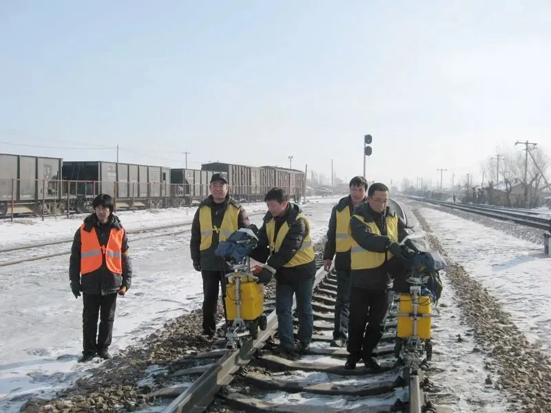铁力工务段探伤工区职工进行探伤钢轨作业。