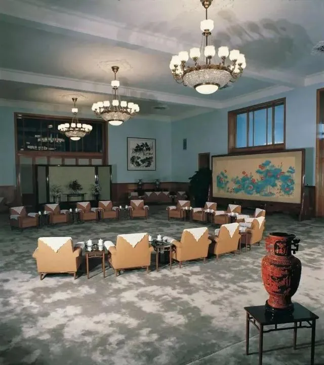 这个内部场景叫地方厅,水晶吊灯一大一小分三层落下,米色沙发围成圈,靠背上白色“梭角”铺巾整齐得厉害,茶几上热水瓶和盖碗排得密,奶奶说第一次电视里见到这样的厅时还以为是大戏台,原来是接待谈事的地儿。