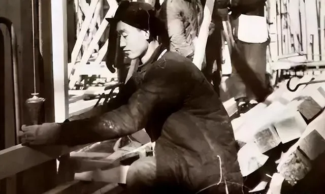 这个小伙子在做的是校正,木方之间垫楔,铁尺在指缝间亮一下就收回去,袖口磨得起毛,寒风里气儿都是白的,他眼睛只盯着那条线,哪怕挪一毫米也不放过,爷爷说,这叫“抠寸”。