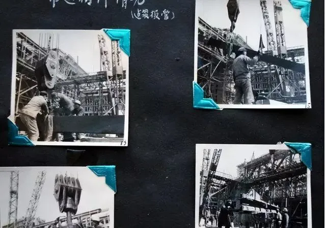 这几张小方片是当年现场影集,手写标题夹在角标下,黑色底卡把银盐的灰度衬得更亮,钢梁起落像在翻书,翻到哪一页就是哪一页的进度。