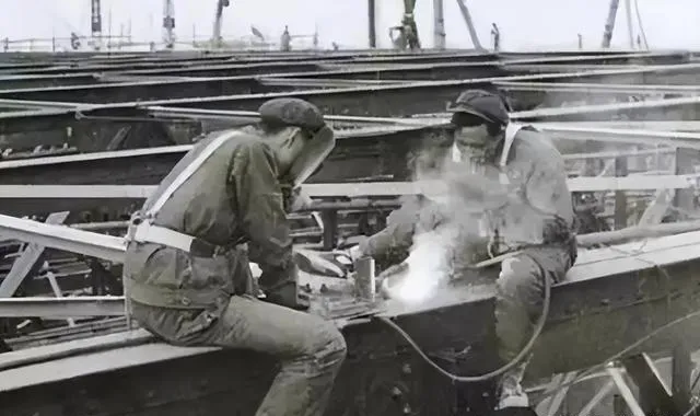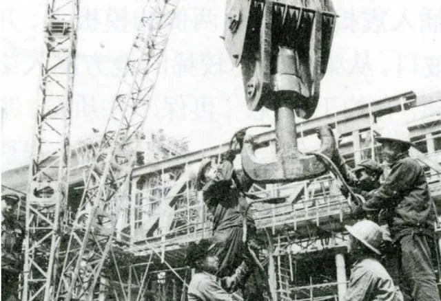 这个一排高杆叫塔吊群,钢缆从顶上分辐射拉出,像撑开的伞面,那会儿设备不多,很多还是东拼西凑的零件,但是一开机,节奏就跟上了,现在看模块化吊装多快,那时候靠人和诀儿。