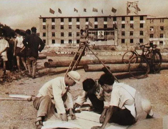 这张是测量队在场坪,三脚架立住,皮尺递过去,图纸压在石头上,旁边停着两辆二八大杠,自行车一倒地,铃铛还会“叮”一声,听着就精神。