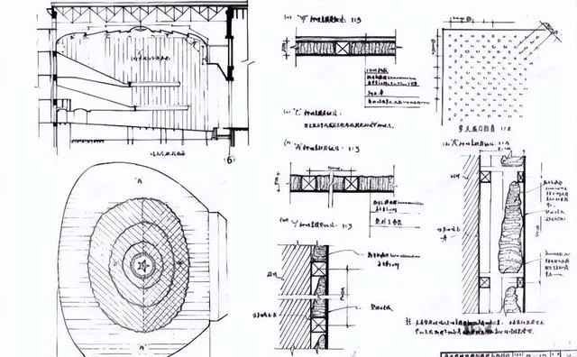 这页手绘是观众厅的吸音构造,圈圈层层往里收,侧墙的孔洞和背衬材料都写着尺寸,老师当年讲声学的时候就拿这张举例,说细到毫米的讲究,最后是观众鼓掌听起来顺耳,这才叫把功夫做在看不见的地方。