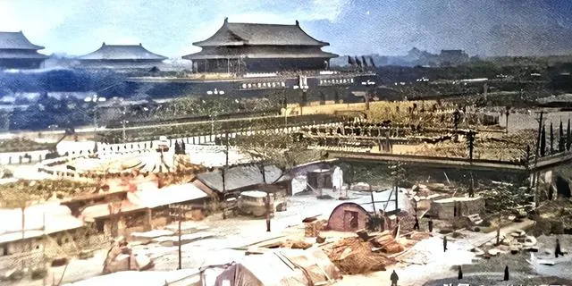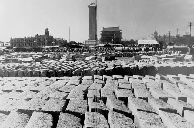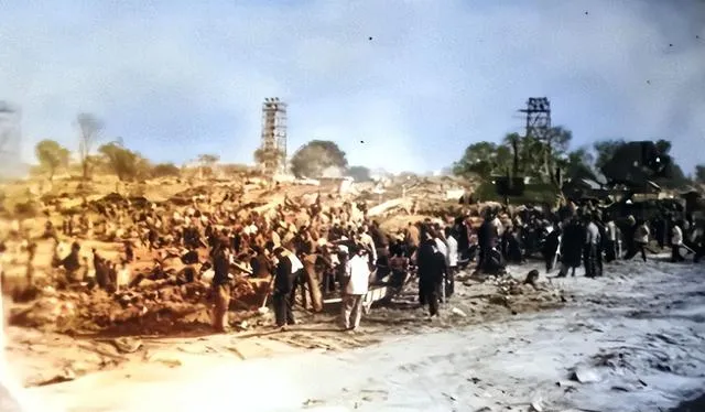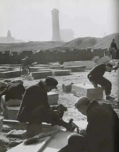 这张彩色老片能看见营地,木棚、料堆、绳索、旗子,一切都围着施工转,城楼在远处压着轴,画面里有股紧张劲儿,但不慌,都是“有数”的忙。
