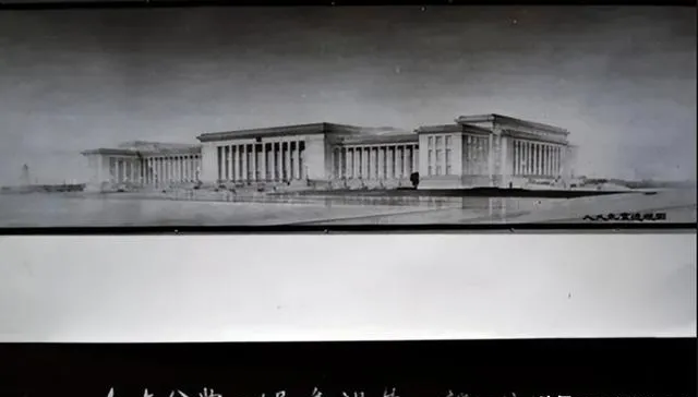这张黑白立面是近竣工时拍的,柱子间还吊着布幅,树影稀疏,地灯像秧苗,镜头一压低,宏大感一下就顶到天灵盖上了。