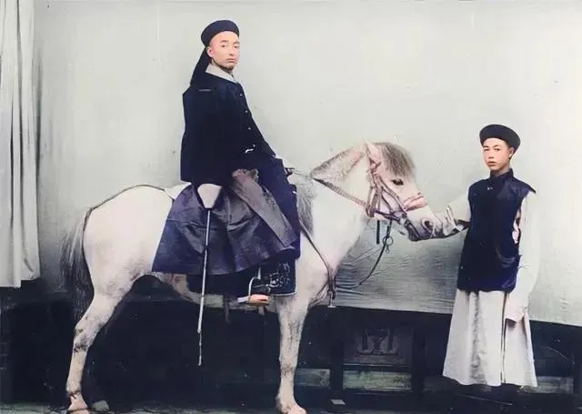 图中这对主仆装束利落,一个骑着白马端着身板,一个牵缰跟在旁边,黑呢长褂配圆檐帽,马鞍是厚皮的,缰绳垂到膝边,姿势一板一眼,像是在照相馆里摆的定式,奶奶看见这张说,当年拍照可金贵了,得挑最体面的衣裳出门才行。