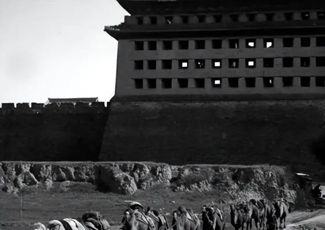 这个画面一眼能认出是城门角楼,墙体上弹洞像眼窝一样黑着,角楼前一串骆驼正慢悠悠走过,驼铃声在风里叮当,爷爷说那年月大车少,外地货靠骆驼驮进京城,天冷风硬,人和骆驼都不敢耽误路。