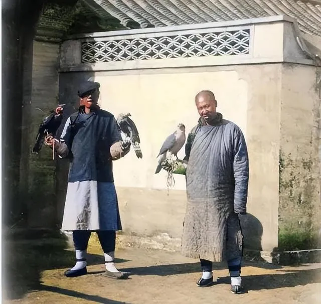 两位手里一人一只隼,护臂是厚皮缠得紧,鸟眼亮得像刀尖,站在墙根儿阴影里,风一来就能闻见皮革味儿和鸟的腥气,老人说这活儿靠耐心,练久了,招手一声,鹰就能从云里掉回你手心。