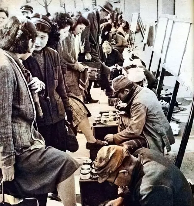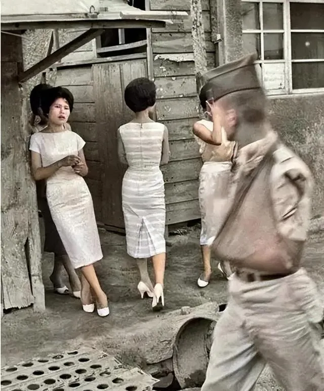 这个木板房门口站着的叫街头女招待,窄腰包裙配白鞋,香烟夹在指缝里抖着灰,她们靠墙歪着身子盯路,脚边是破水沟盖板,一个军人急匆匆掠过,风把裙摆掀了一点点,就像那年代的体面也只剩那么一点点。