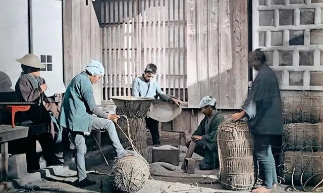 图中这大个头叫稻草笼,粗绳一圈一圈缠成肚皮,口沿用竹篾收紧,农人盘腿按着笼身打结,脚背顶着木楔子别住力道,奶奶说装粮装炭都能用,潮气大时外头再裹一层草帘子,比木箱轻得多,耐造还不怕摔。